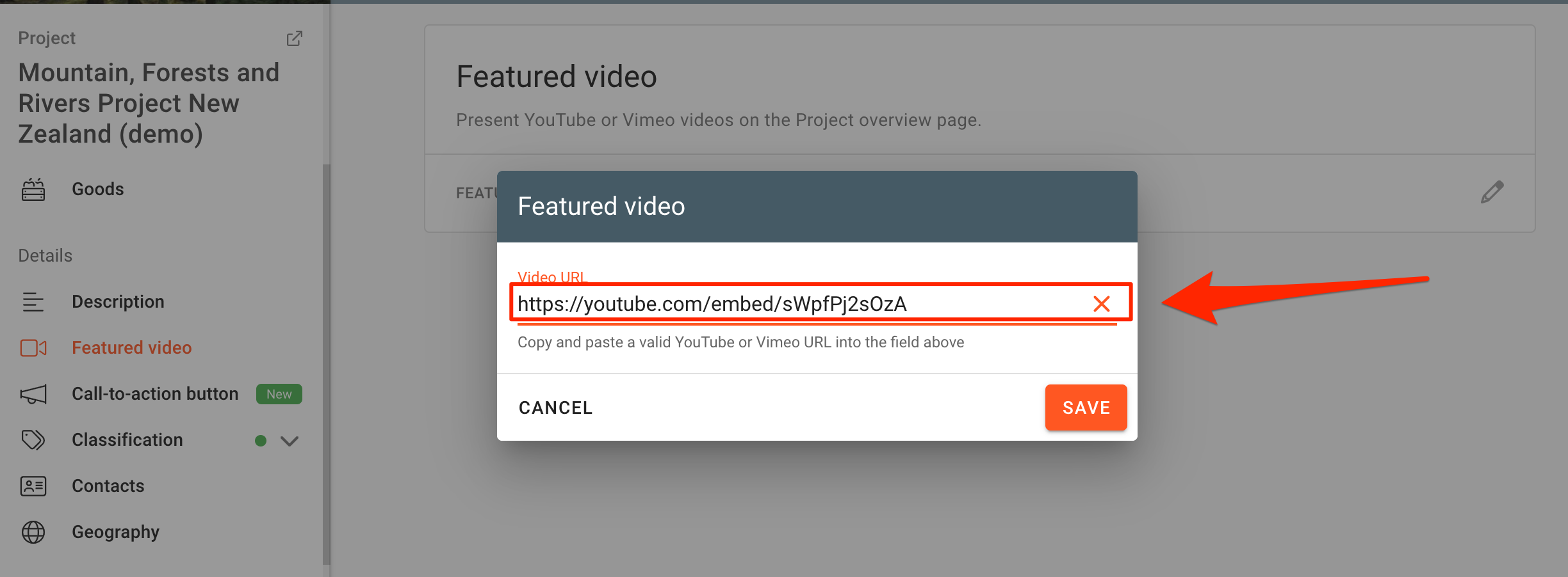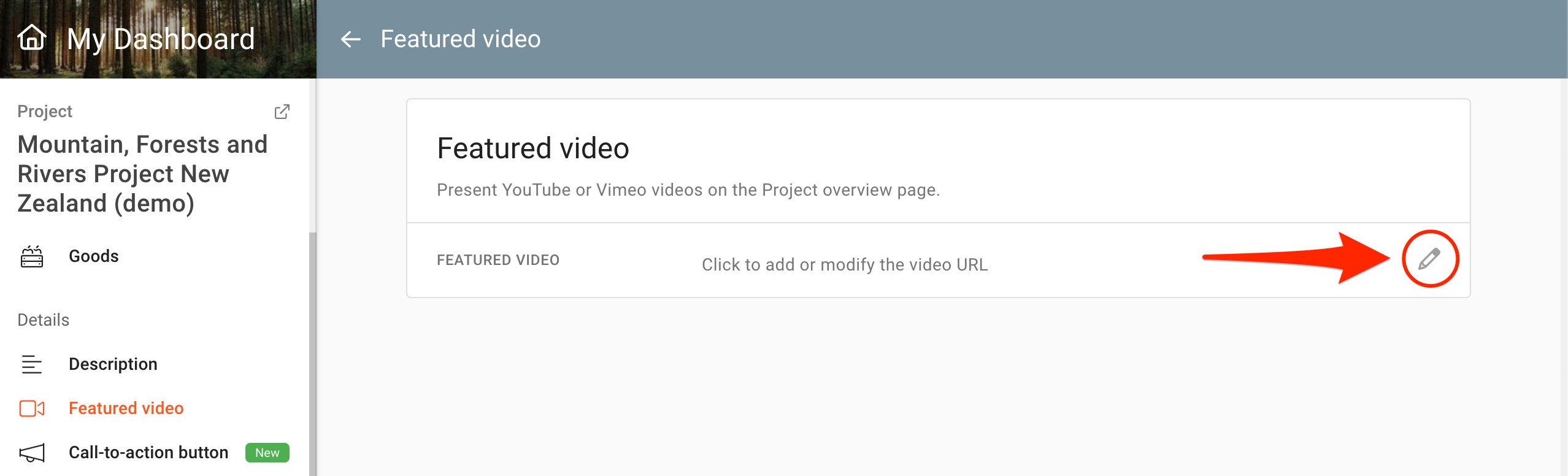 To add a video, navigate to the Project Management Panel and select “Featured Video” on the menu on the left. This will open the Featured Video management page.