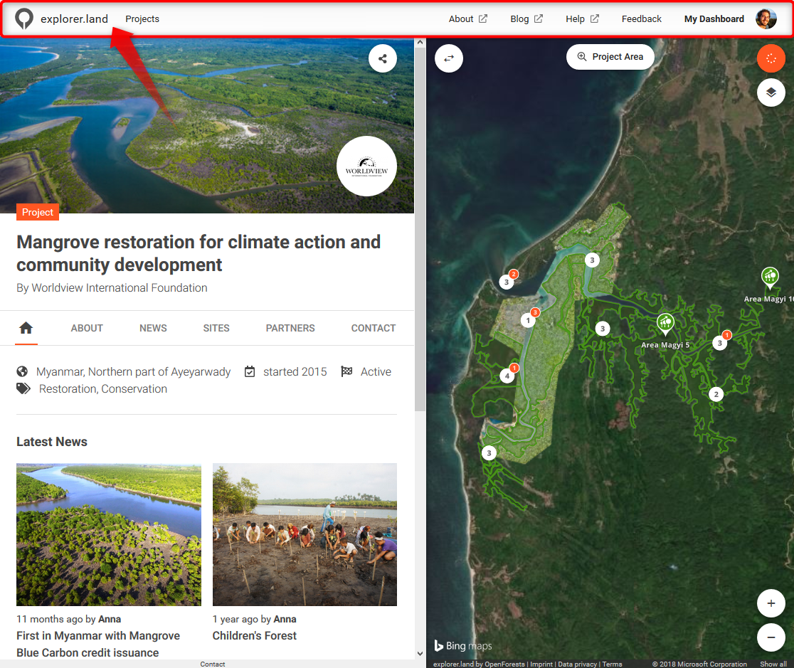 When accessing a Project using the general URL, it will be embedded in the platform's frame with the navigation bar available on the top, allowing users to navigate away from your Project (e.g. accessing the search engine of explorer.land).