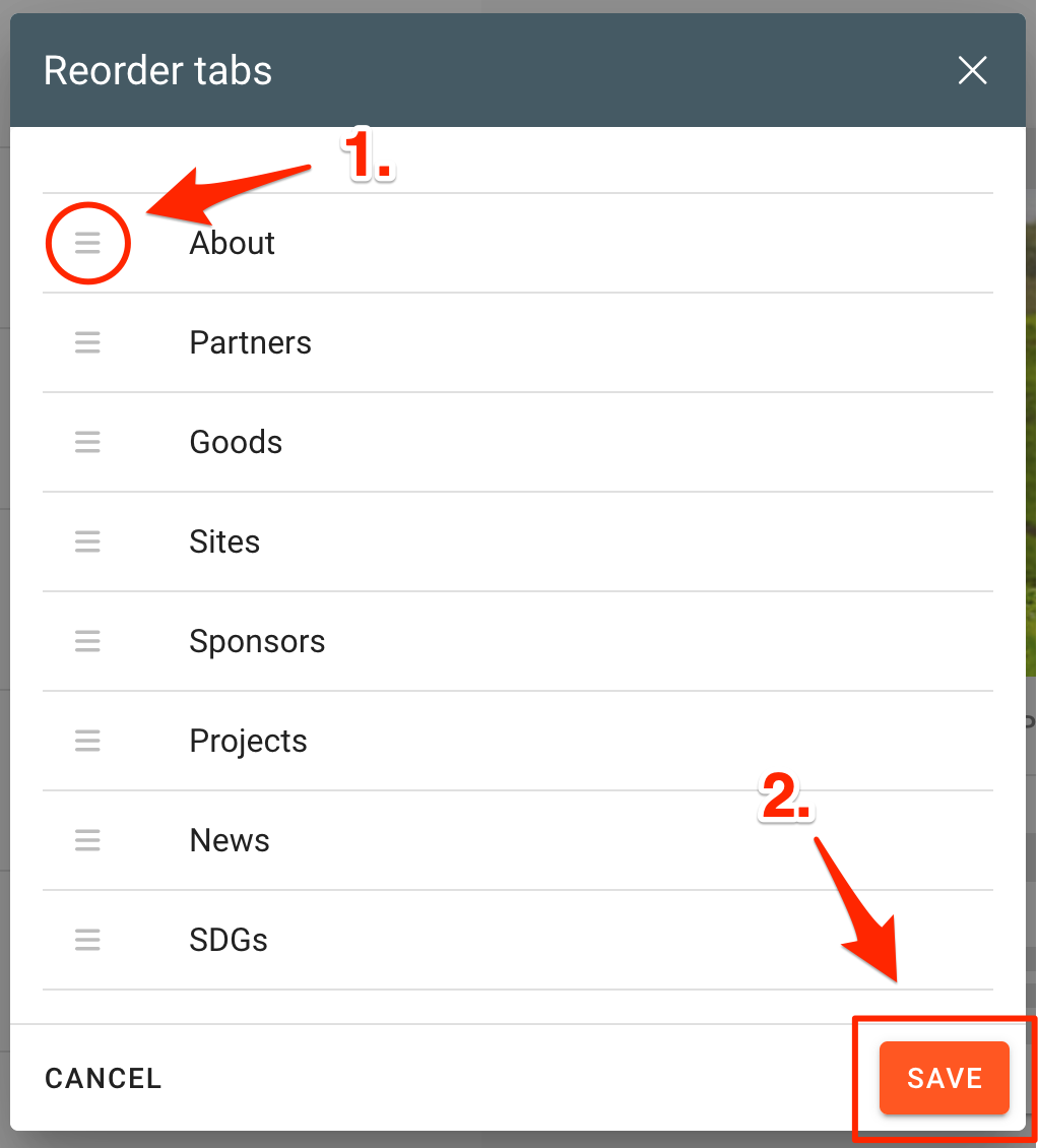 The "Reorder tabs" window will open. You will now be able to reorder the tabs by dragging the tabs up and down to your preferred order β . Click Save when you are finished β‘.