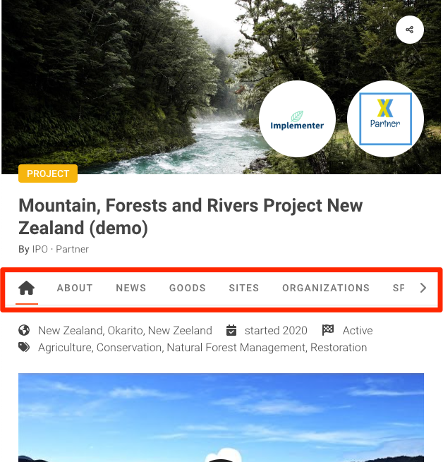 The Tabs containing information about your project, such as About, News, Sites and so on is located on the left side bar of your Project presentation page.