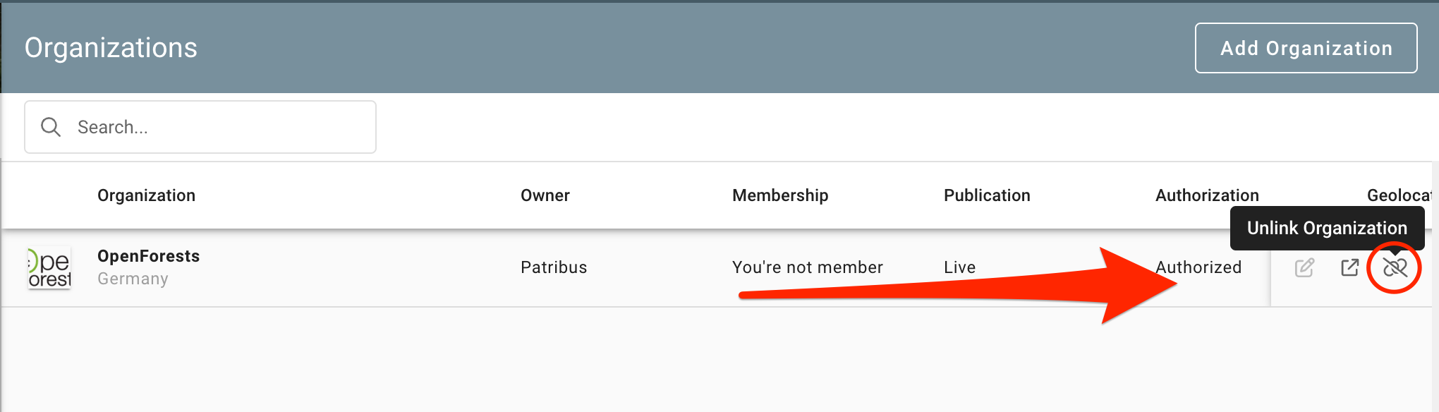 If you wish to Unlink an Organization, go back to the Organizations management page and simply click on the "Unlink Organization" icon of the relevant Organization.