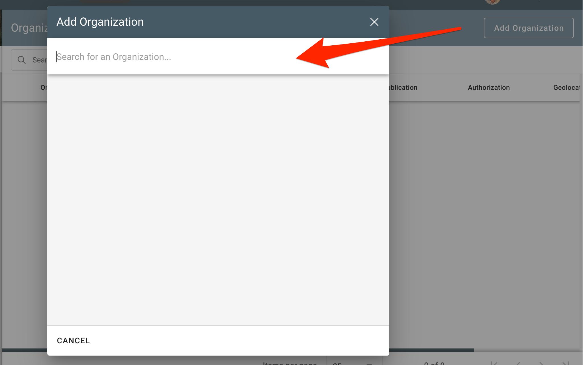 A window with a search bar will pop-up, for you to write the name of the Organization you want to add.