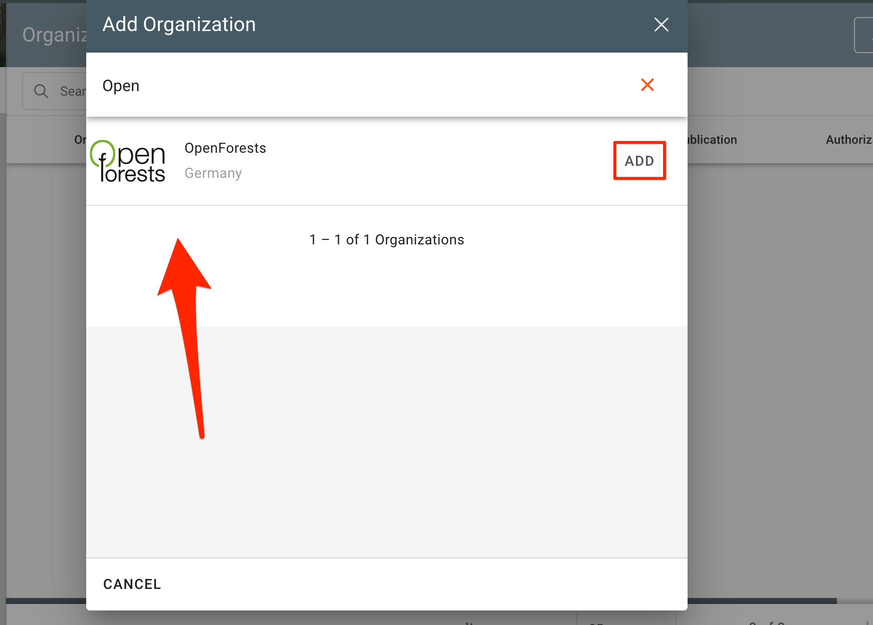 As you start typing, the results will appear below the search bar. Select the Organization you want to add by clicking on the respective "ADD" button or cancel action by using the "CANCEL" button.