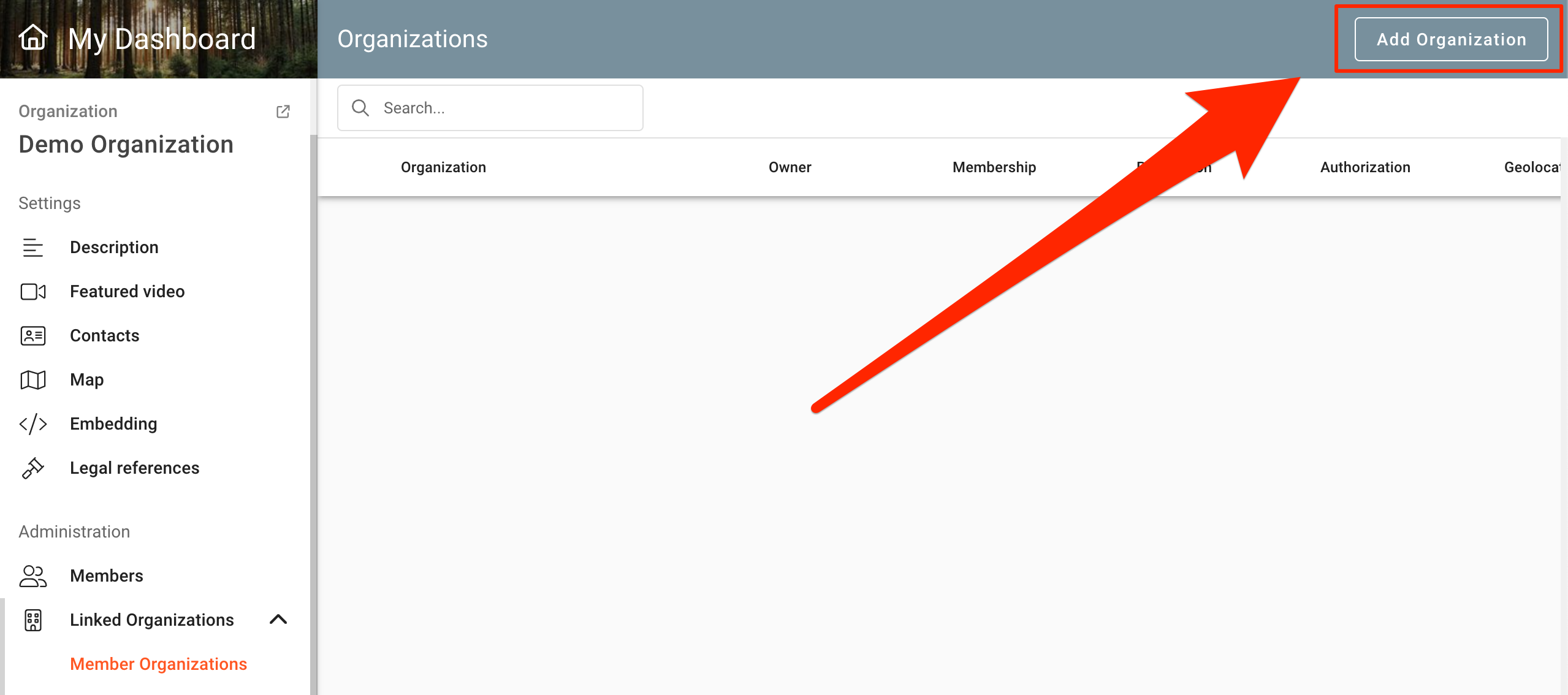 This will open the Organizations management page, where you can click on the "Add Organization" button.