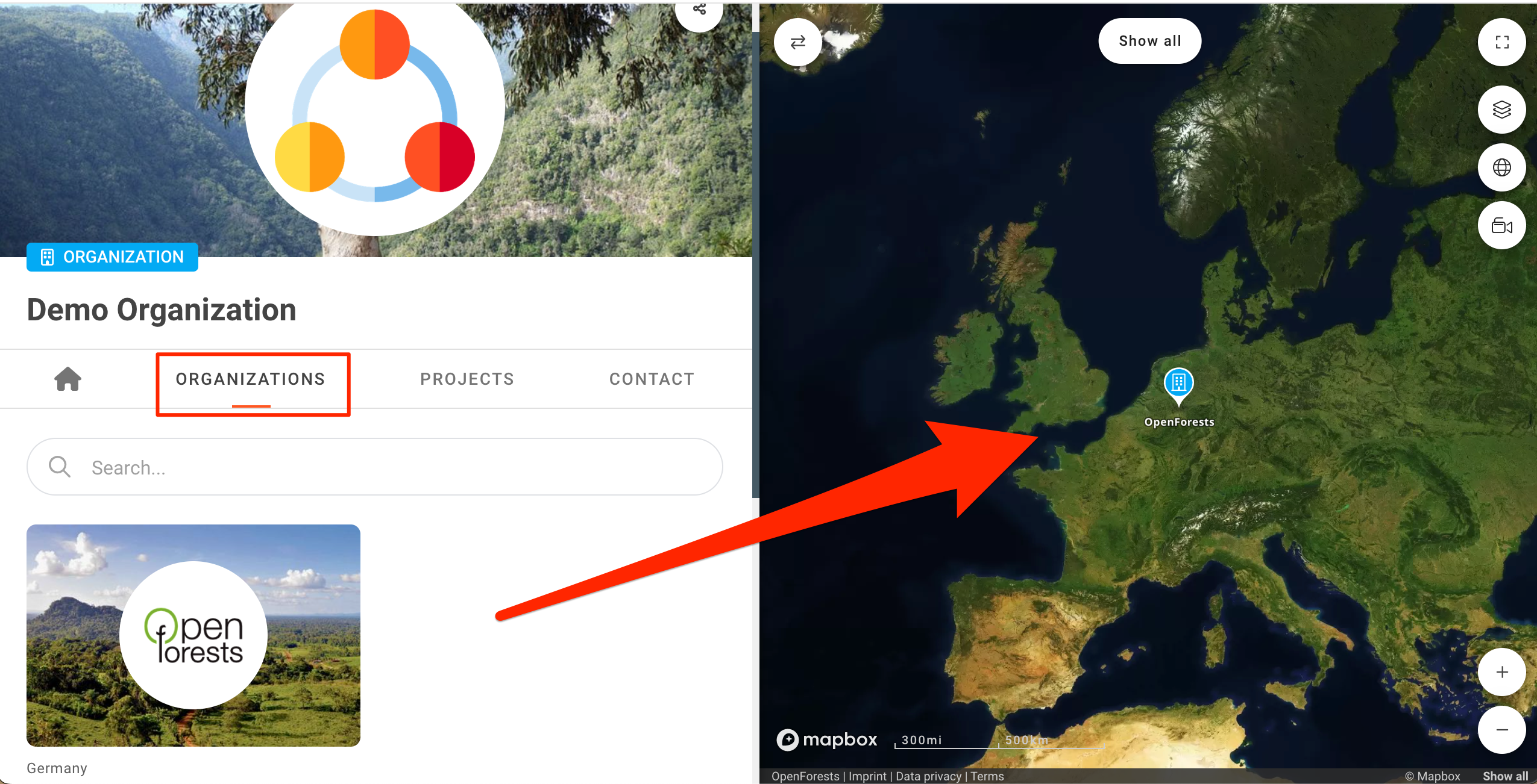 You can also link the projects of your member organizations to your Umbrella Organization. They will then appear under the projects tab and on the map of your Umbrella Organization.