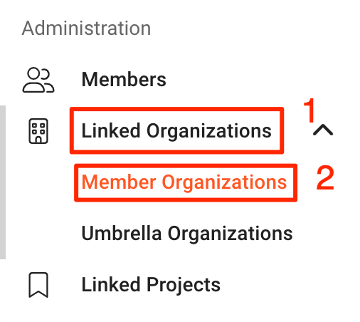 To add member organizations to your Umbrella Organization, navigate to the organization management panel on the left side and click the βLinked Organizationsβ dropdown menu β , followed by "Member Organizations" β‘.