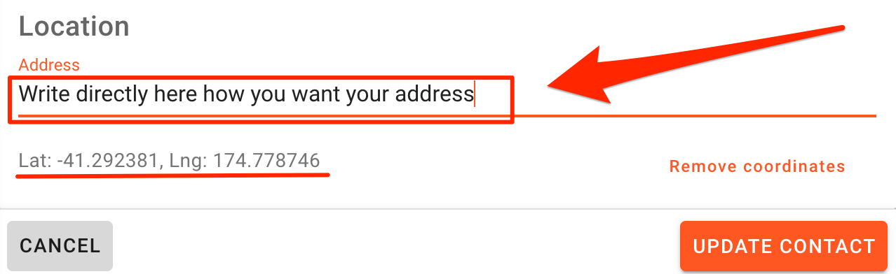 If you don't like the way the address appears written, you can manually rewrite it according to your preference directly in the address field, while keeping the coordinates so that the location on the map remains intact.