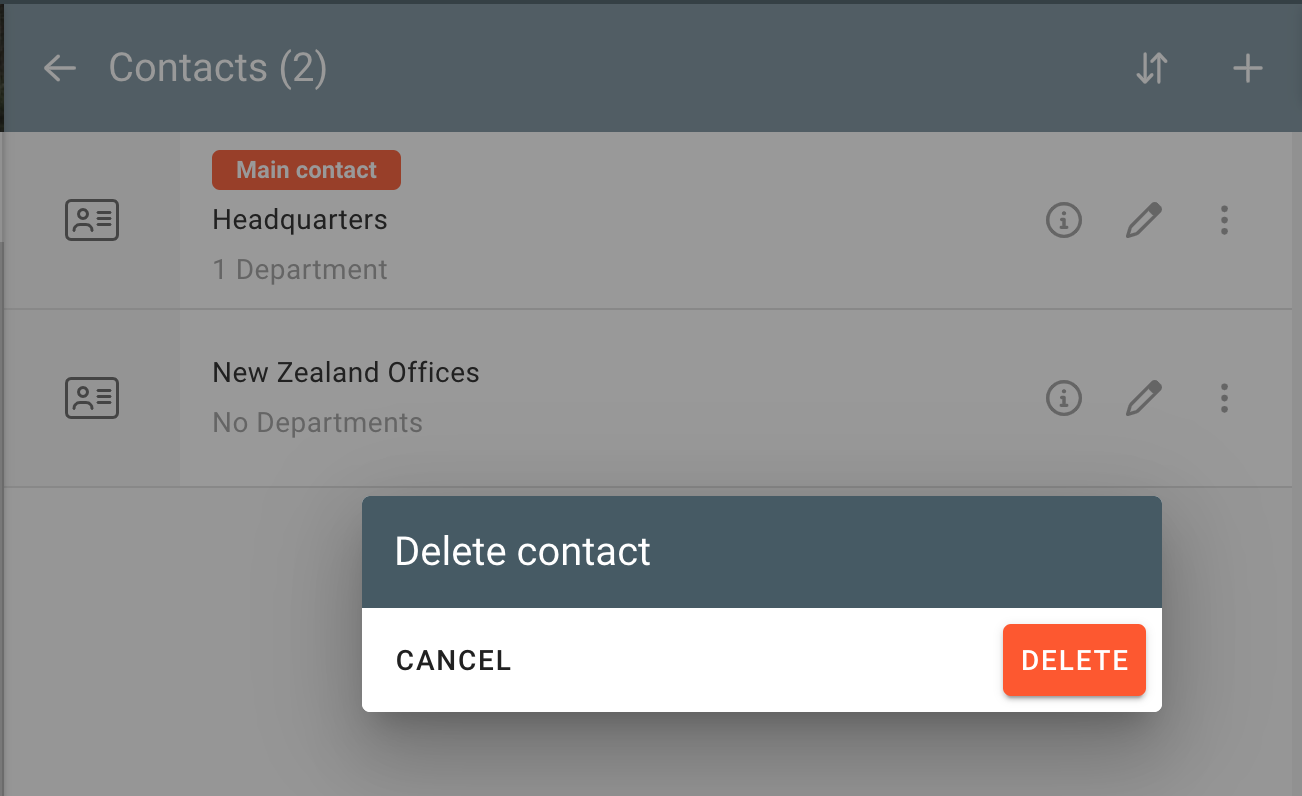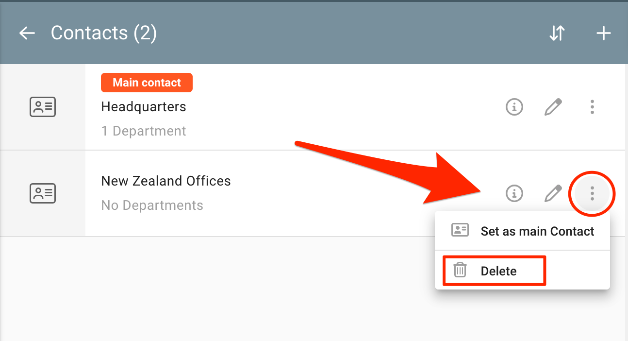 In order to delete a Contact, just click on the "three dots" icon on the relevant contact, and select the "Delete" button.