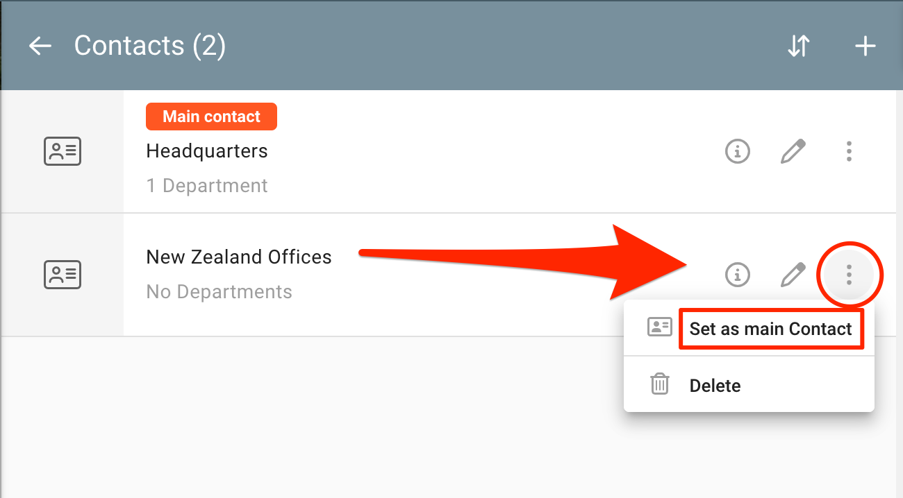 The first contact added to your Project becomes by default the Main Contact. If you wish to change that, just click on the "three dots" icon on the relevant contact, and select the "Set as main Contact" option.