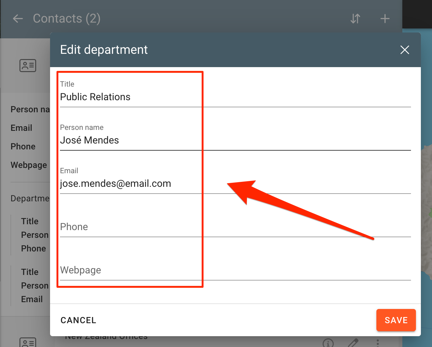 Fill out the fields as needed. Note that it is mandatory to fill out at least one of the following three fields: Email, Phone or Webpage.