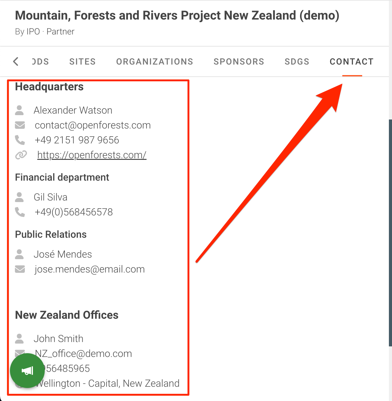 When you create a Project or an Organization, it is mandatory to associate at least one contact. It will appear on your Project page under the "Contact" tab, and will ensure there is a means of communication between the visitors and someone responsible for the Project or Organization.