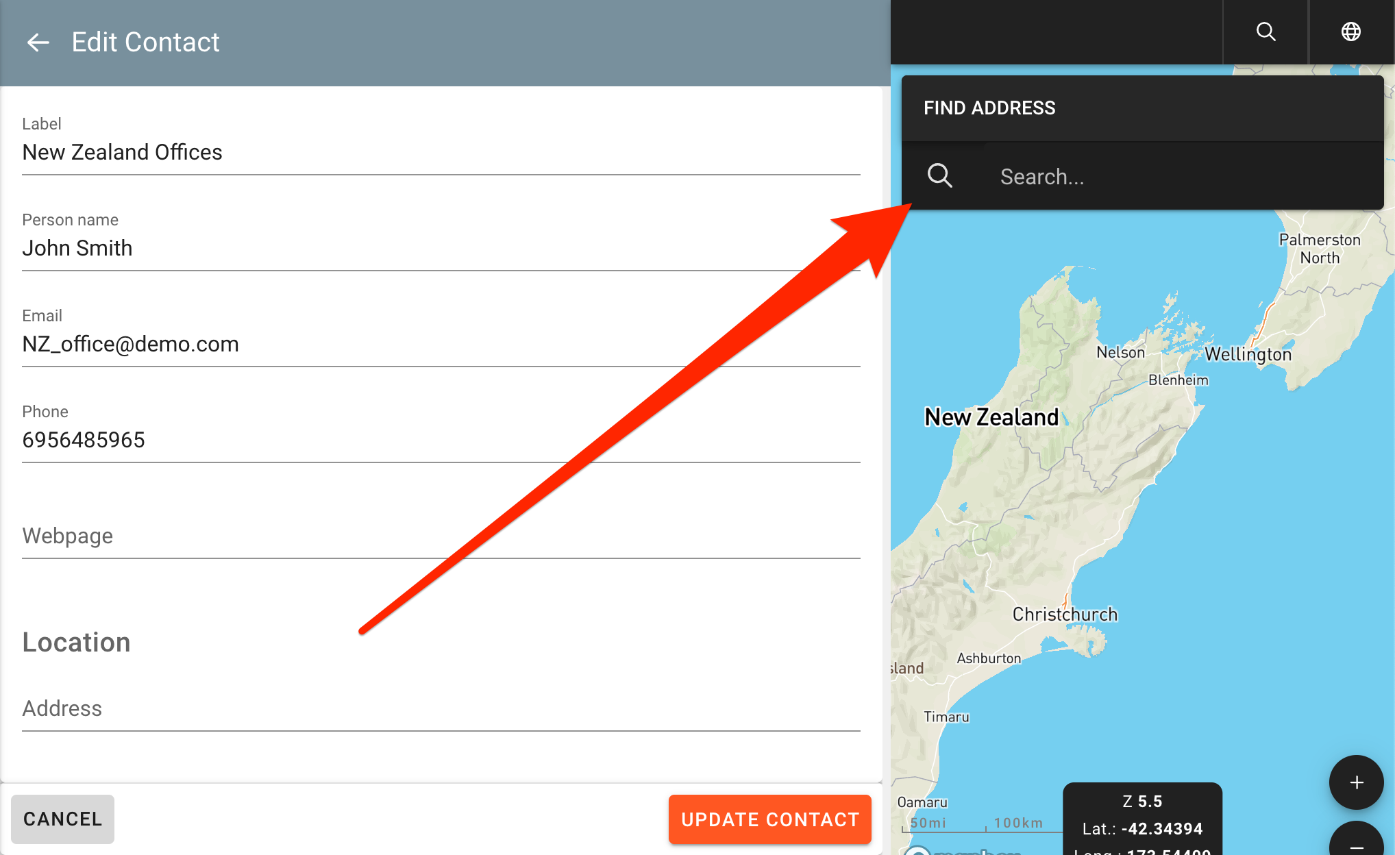 As previously mentioned above, while editing the Contacts you can also set a location for each of them. Start by typing the relevant address in the search box that appears on the upper right side of the screen