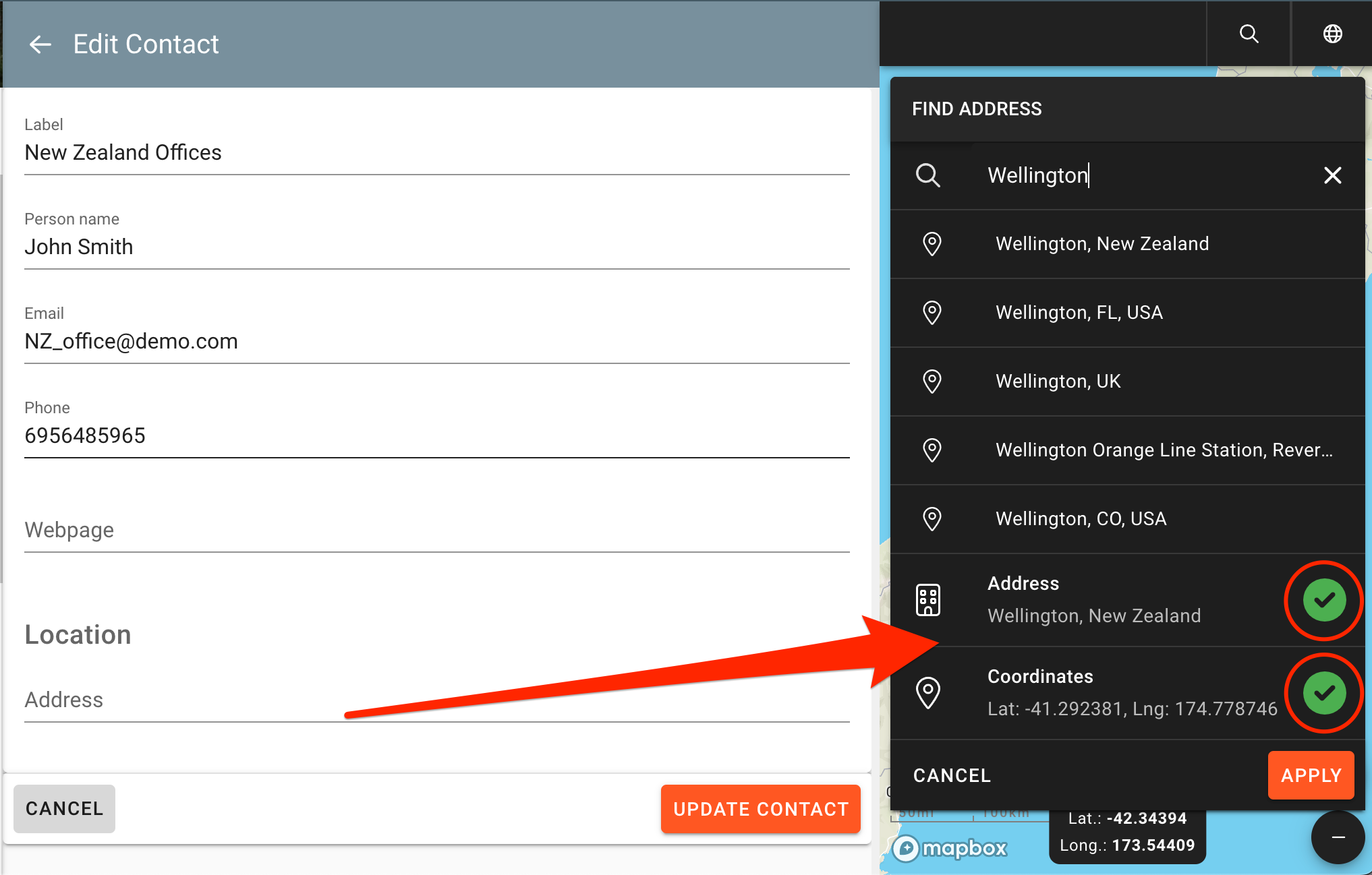When the address is found in the search results, it will appear written in the Location field and with the specific coordinates, enabling the contact's geolocation on the map. In case you don't want to have either the written address or the coordinates, you can remove them by clicking on the respective green icons.