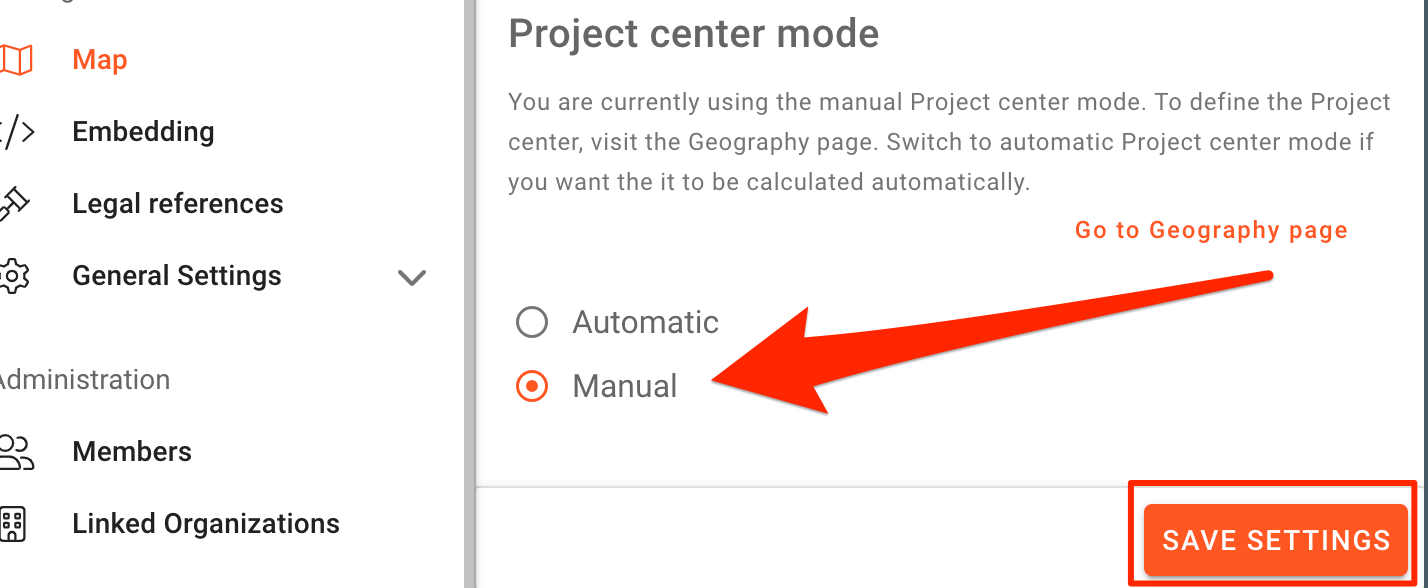 Navigate to the Project management panel and select “Map” on the menu on the left. This will open the Map Settings page.