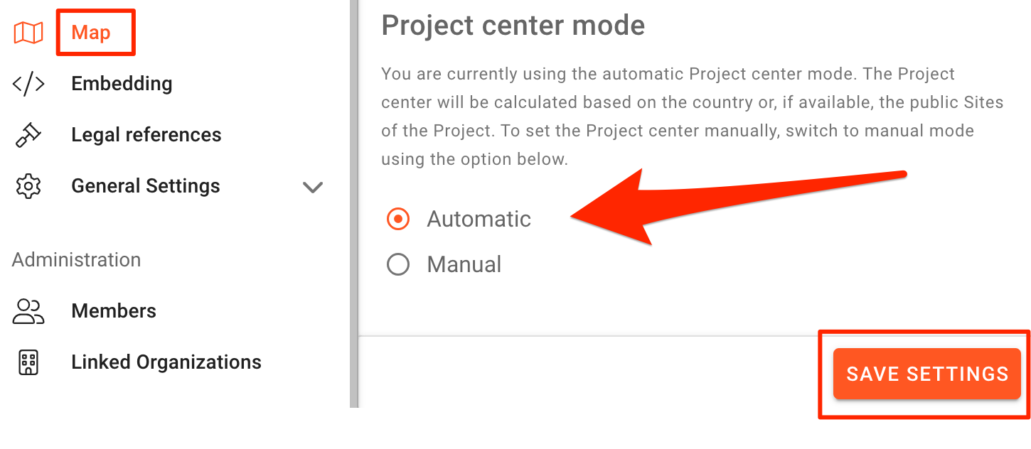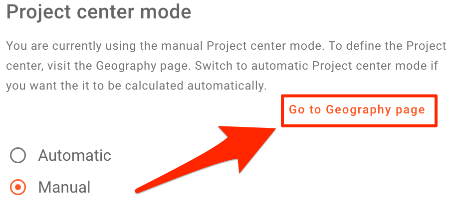 For that you can switch from the automatic to the manual mode. This allows setting the Project center independently of the Site’s locations, which might be important if you have widespread Sites or, for instance, just want to set the Project’s headquarters as the Project center.
