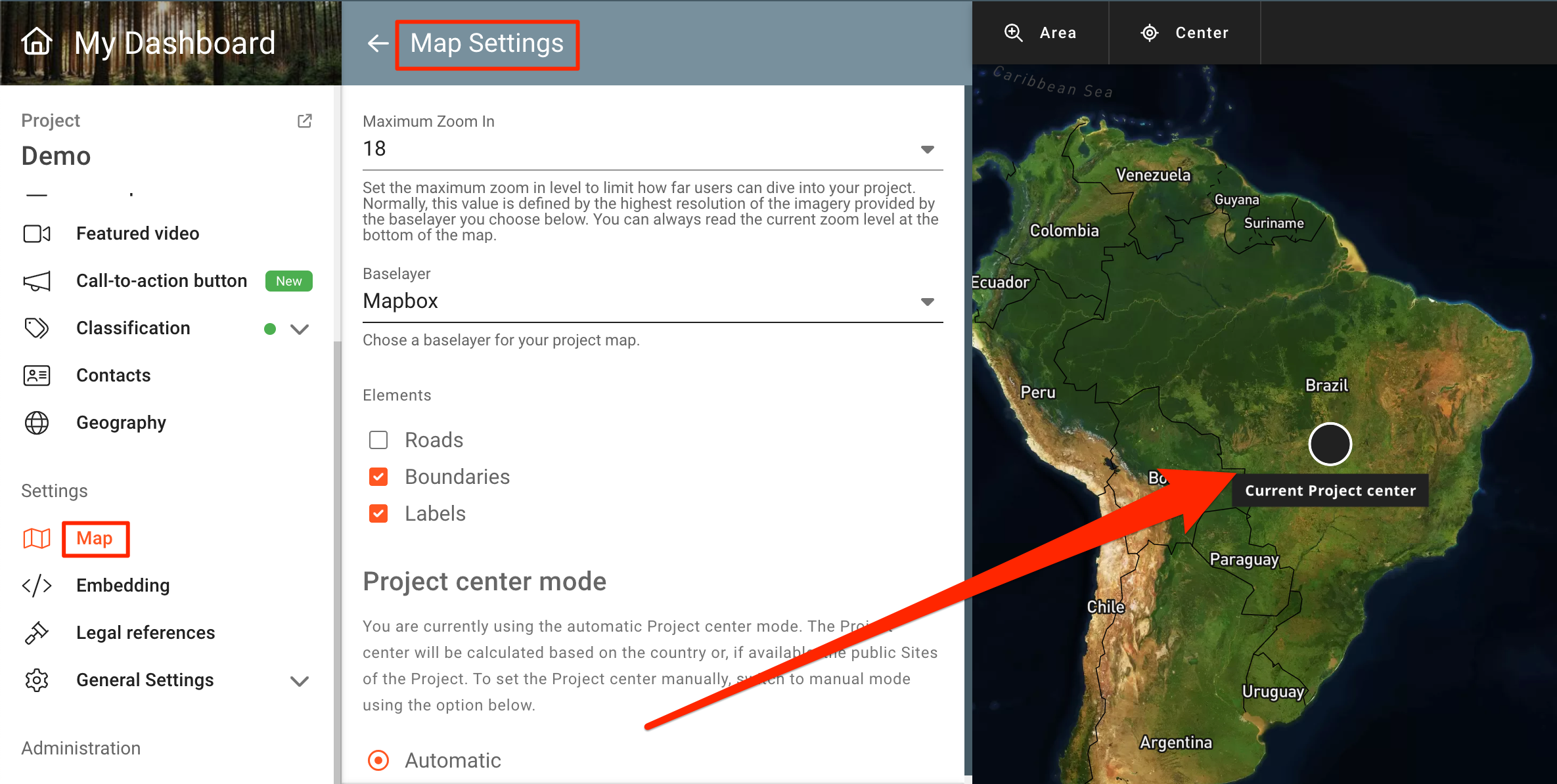 When creating a Project, the center is calculated automatically based on the published Sites or, in case no Sites are published, on the Project's selected country.