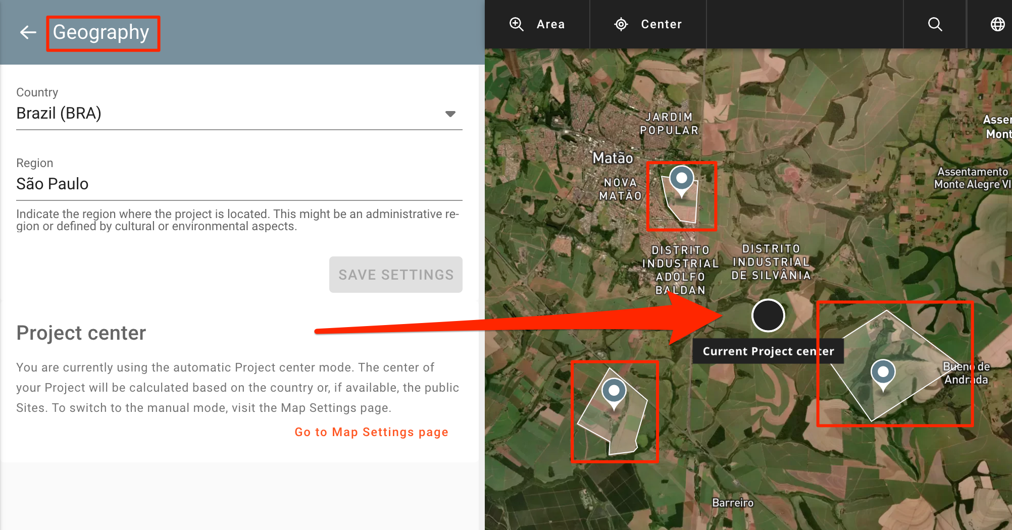 To see where your Project center will be after creating one, or multiple Sites, navigate to the Project management panel and select “Geography” on the menu on the left. This will open the Geography management page.
