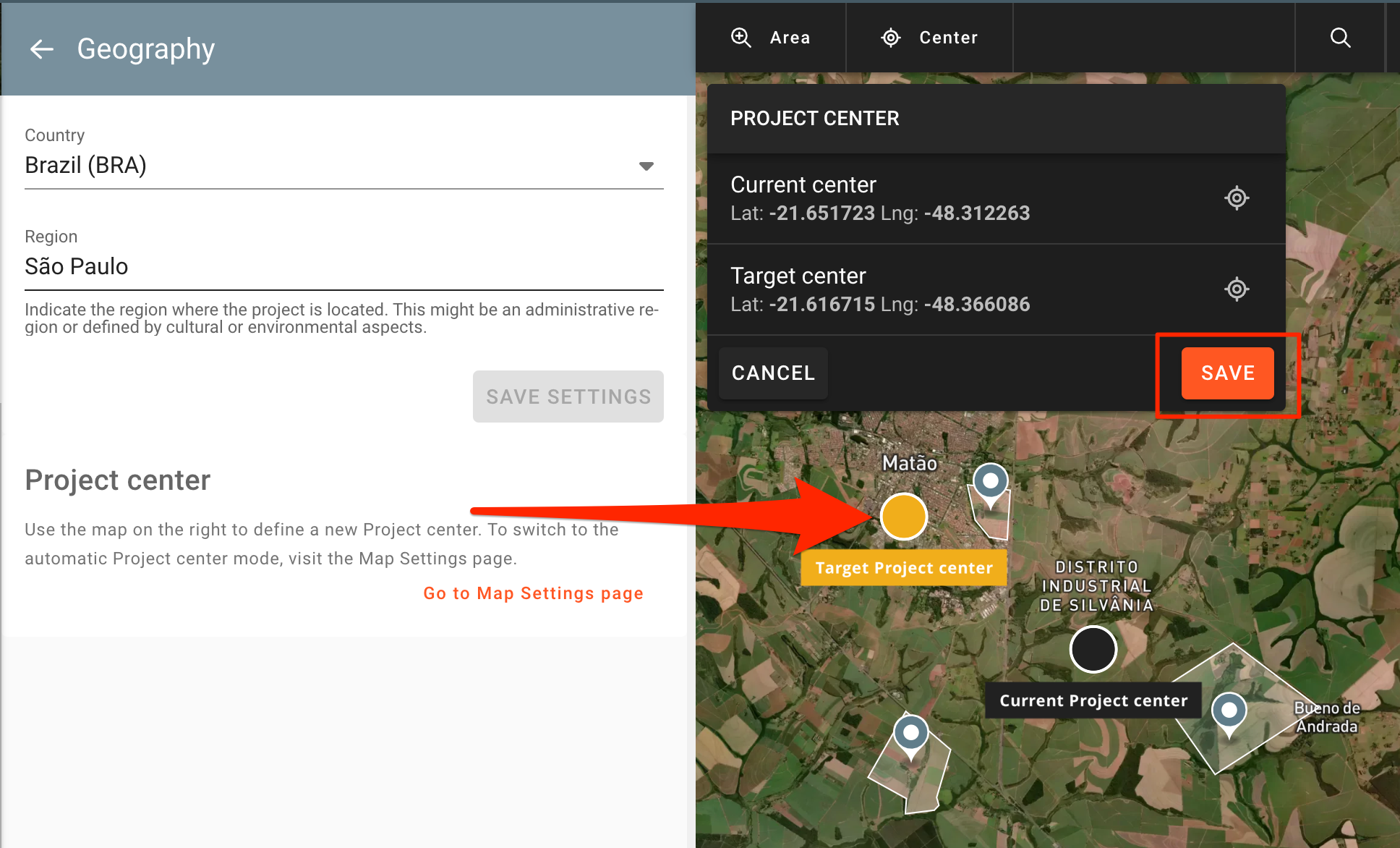 Choose the new Project center by clicking the spot on the map where you want to have it.