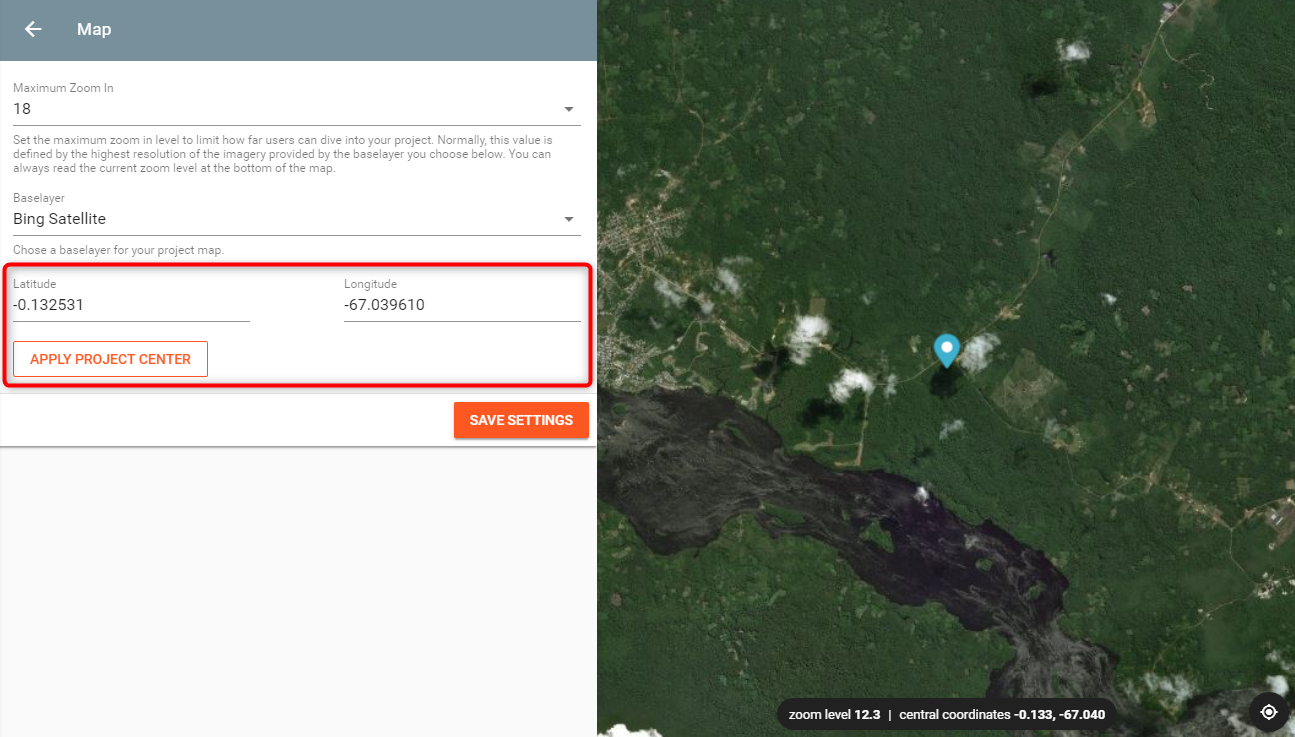 In the map setting page, zoom out & in and move the map until you locate the Project area. Once you have set the marker in the center of the Project area, click on the APPLY PROJECT CENTER button to read the coordinates. Save them by clicking on the SAVE SETTINGS button.