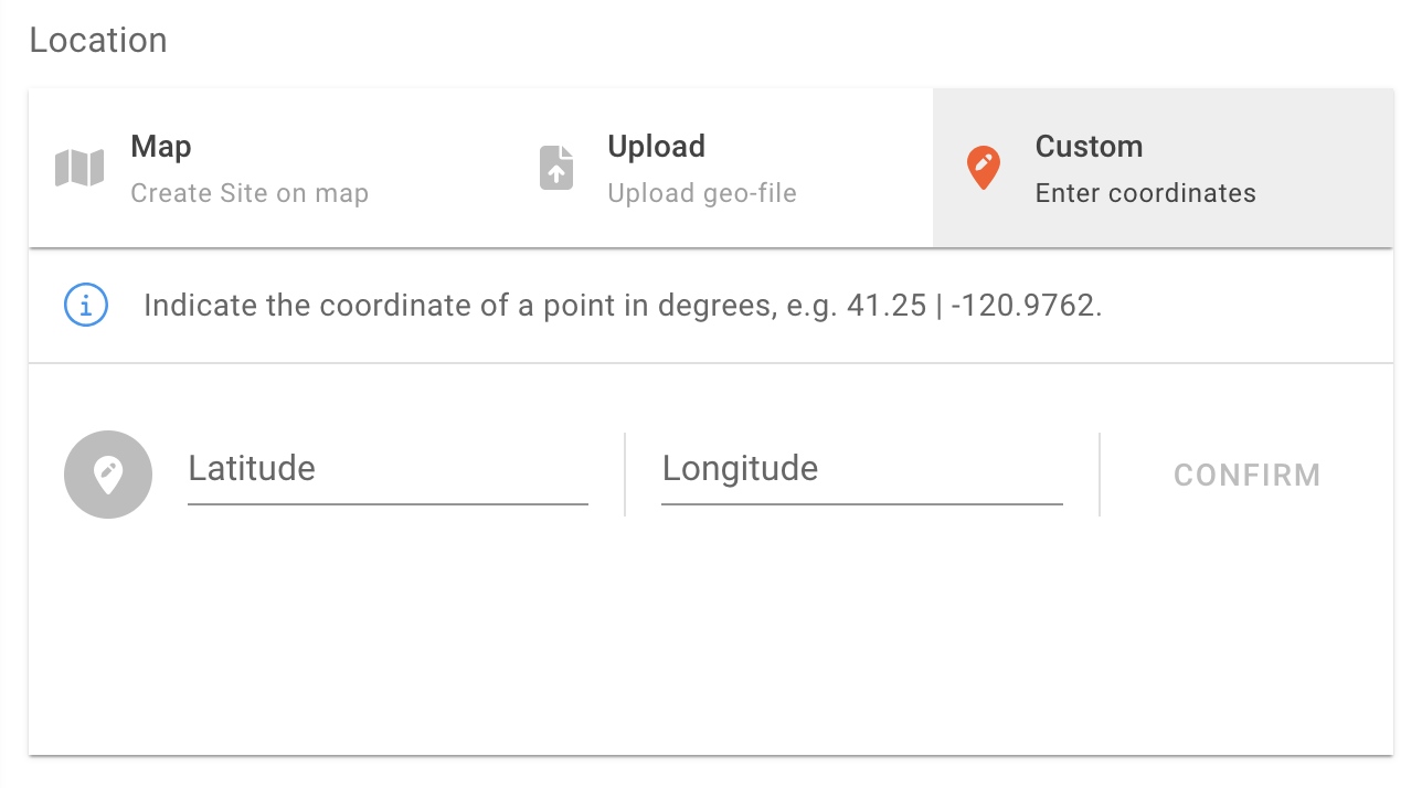 Custom - Manually input the coordinates of a point in degrees. Click confirm after imputing coordinates, the map will zoom in to the location.