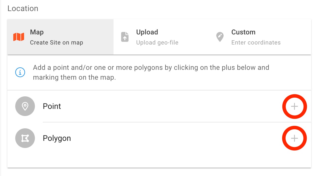 Map - Add a point and/or one or more polygons by clicking on the plus icons and marking them on the map.