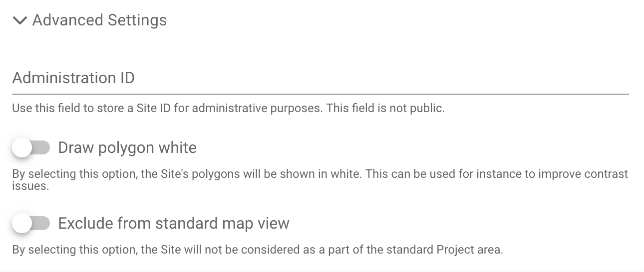 Exclude from standard map view: By selecting this option, the Site will not be considered as a part of the standard Project area. This is relevant when zooming into the project area of the project. The site will still be visible on the map and under the sites tab.